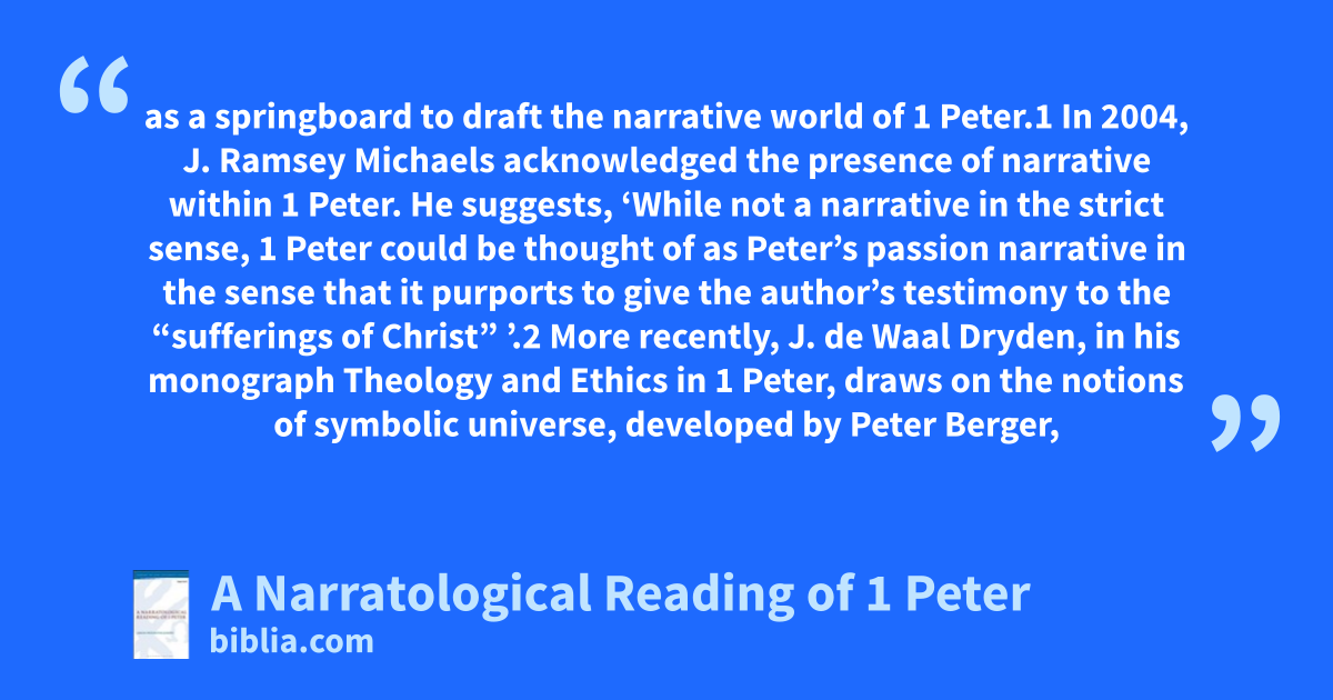 as a springboard to draft the narrative world of 1 Peter.1 In 2004, J. Ramsey Michaels acknowledged the presence of narrative within 1 Peter. He suggests, ‘While not a narrative in the strict sense, 1 Peter could be thought of as Peter’s passion narrative in the sense that it purports to give the author’s testimony to the “sufferings of Christ” ’.2 More recently, J. de Waal Dryden, in his monograph Theology and Ethics in 1 Peter, draws on the notions of symbolic universe, developed by Peter Berger,