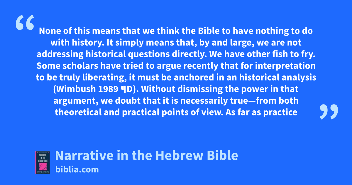 None of this means that we think the Bible to have nothing to do with history. It simply means that, by and large, we are not addressing historical questions directly. We have other fish to fry. Some scholars have tried to argue recently that for interpretation to be truly liberating, it must be anchored in an historical analysis (Wimbush 1989 ¶D). Without dismissing the power in that argument, we doubt that it is necessarily true—from both theoretical and practical points of view. As far as practice