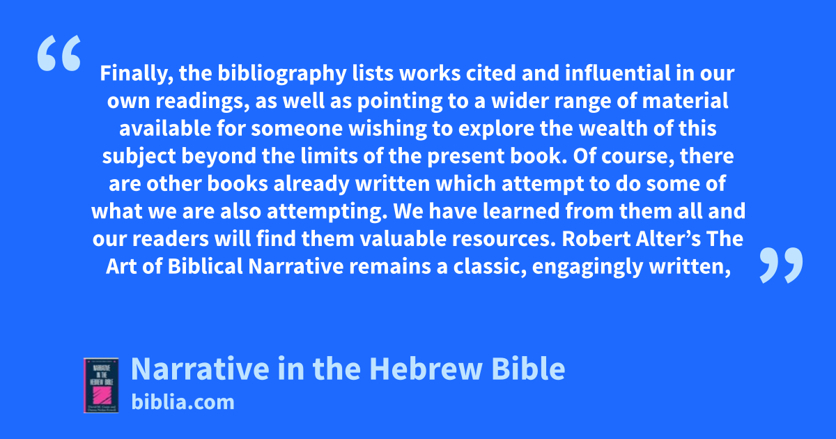 Finally, the bibliography lists works cited and influential in our own readings, as well as pointing to a wider range of material available for someone wishing to explore the wealth of this subject beyond the limits of the present book. Of course, there are other books already written which attempt to do some of what we are also attempting. We have learned from them all and our readers will find them valuable resources. Robert Alter’s The Art of Biblical Narrative remains a classic, engagingly written,