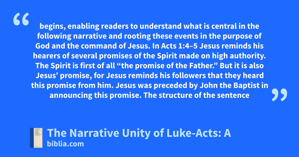 begins, enabling readers to understand what is central in the following narrative and rooting these events in the purpose of God and the command of Jesus. In Acts 1:4–5 Jesus reminds his hearers of several promises of the Spirit made on high authority. The Spirit is first of all “the promise of the Father.” But it is also Jesus’ promise, for Jesus reminds his followers that they heard this promise from him. Jesus was preceded by John the Baptist in announcing this promise. The structure of the sentence