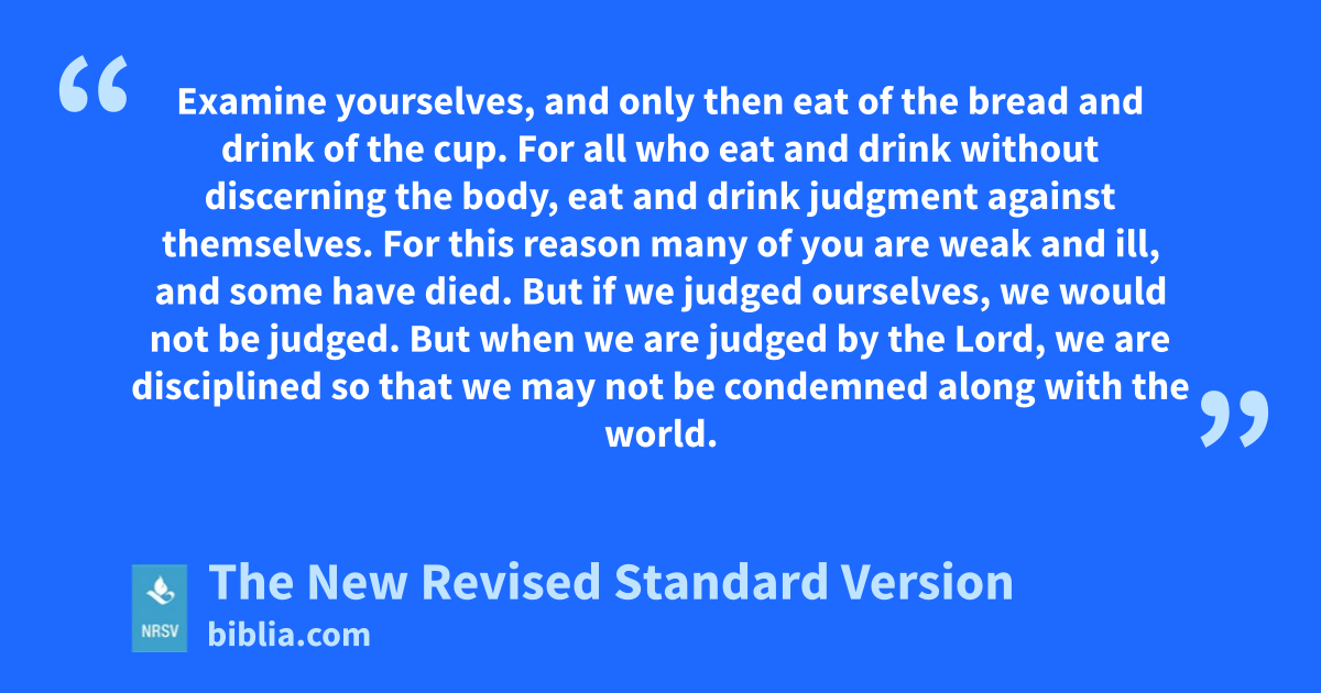 Examine yourselves, and only then eat of the bread and drink of the cup. For all who eat and drink without discerning the body, eat and drink judgment against themselves. For this reason many of you are weak and ill, and some have died. But if we judged ourselves, we would not be judged. But when we are judged by the Lord, we are disciplined so that we may not be condemned along with the world.
