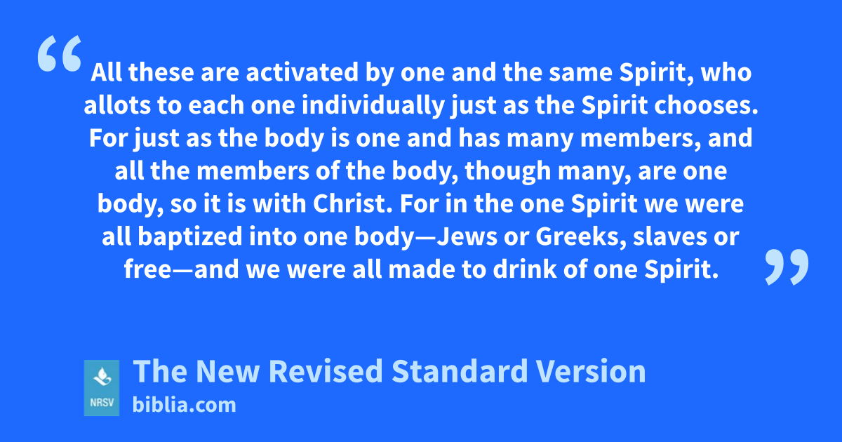All these are activated by one and the same Spirit, who allots to each one individually just as the Spirit chooses. For just as the body is one and has many members, and all the members of the body, though many, are one body, so it is with Christ. For in the one Spirit we were all baptized into one body—Jews or Greeks, slaves or free—and we were all made to drink of one Spirit.