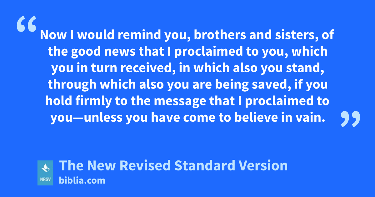 Now I would remind you, brothers and sisters, of the good news that I proclaimed to you, which you in turn received, in which also you stand, through which also you are being saved, if you hold firmly to the message that I proclaimed to you—unless you have come to believe in vain.