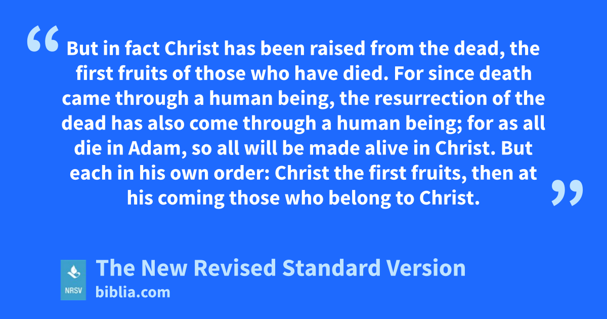 But in fact Christ has been raised from the dead, the first fruits of those who have died. For since death came through a human being, the resurrection of the dead has also come through a human being; for as all die in Adam, so all will be made alive in Christ. But each in his own order: Christ the first fruits, then at his coming those who belong to Christ.