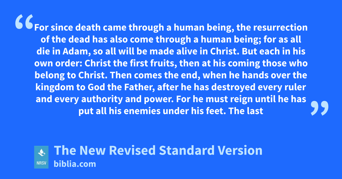 For since death came through a human being, the resurrection of the dead has also come through a human being; for as all die in Adam, so all will be made alive in Christ. But each in his own order: Christ the first fruits, then at his coming those who belong to Christ. Then comes the end, when he hands over the kingdom to God the Father, after he has destroyed every ruler and every authority and power. For he must reign until he has put all his enemies under his feet. The last