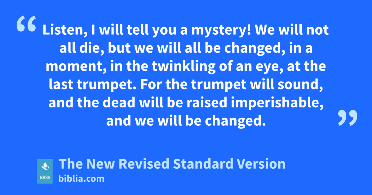 Listen, I will tell you a mystery! We will not all die, but we will all be changed, in a moment, in the twinkling of an eye, at the last trumpet. For the trumpet will sound, and the dead will be raised imperishable, and we will be changed.