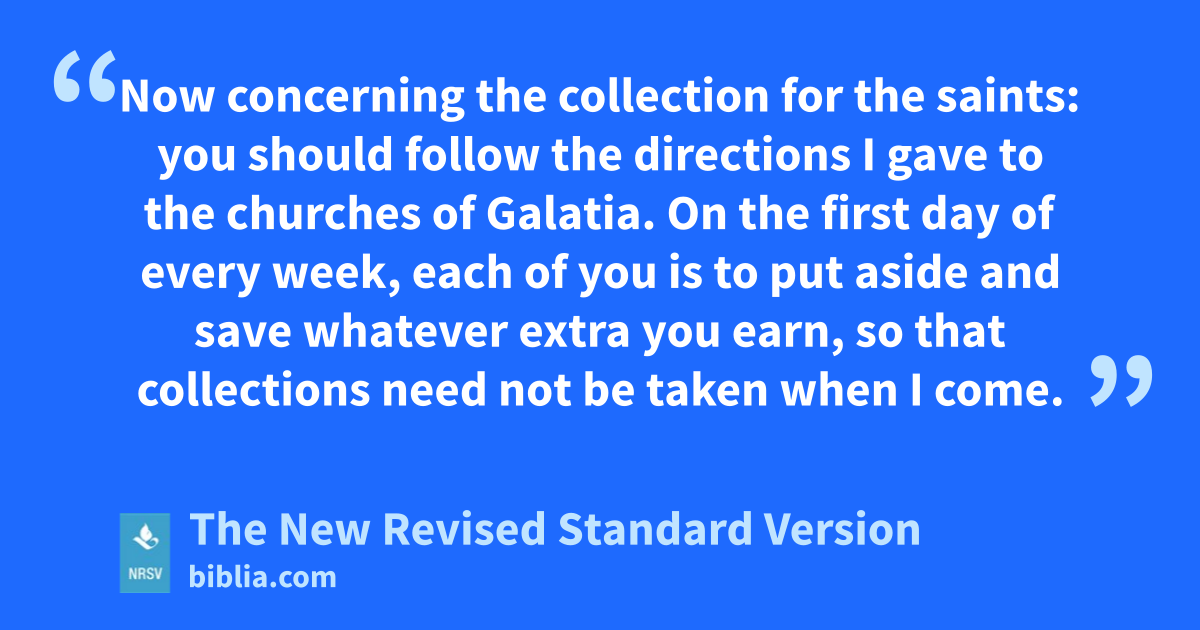 Now concerning the collection for the saints: you should follow the directions I gave to the churches of Galatia. On the first day of every week, each of you is to put aside and save whatever extra you earn, so that collections need not be taken when I come.