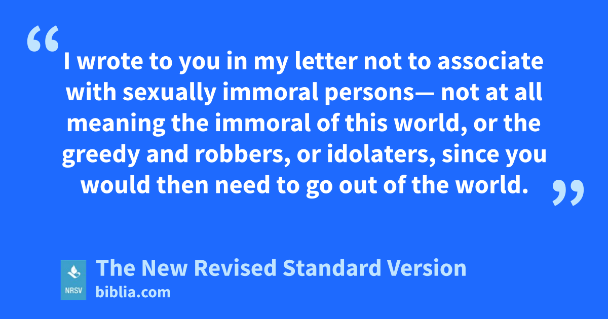 I wrote to you in my letter not to associate with sexually immoral persons— not at all meaning the immoral of this world, or the greedy and robbers, or idolaters, since you would then need to go out of the world.