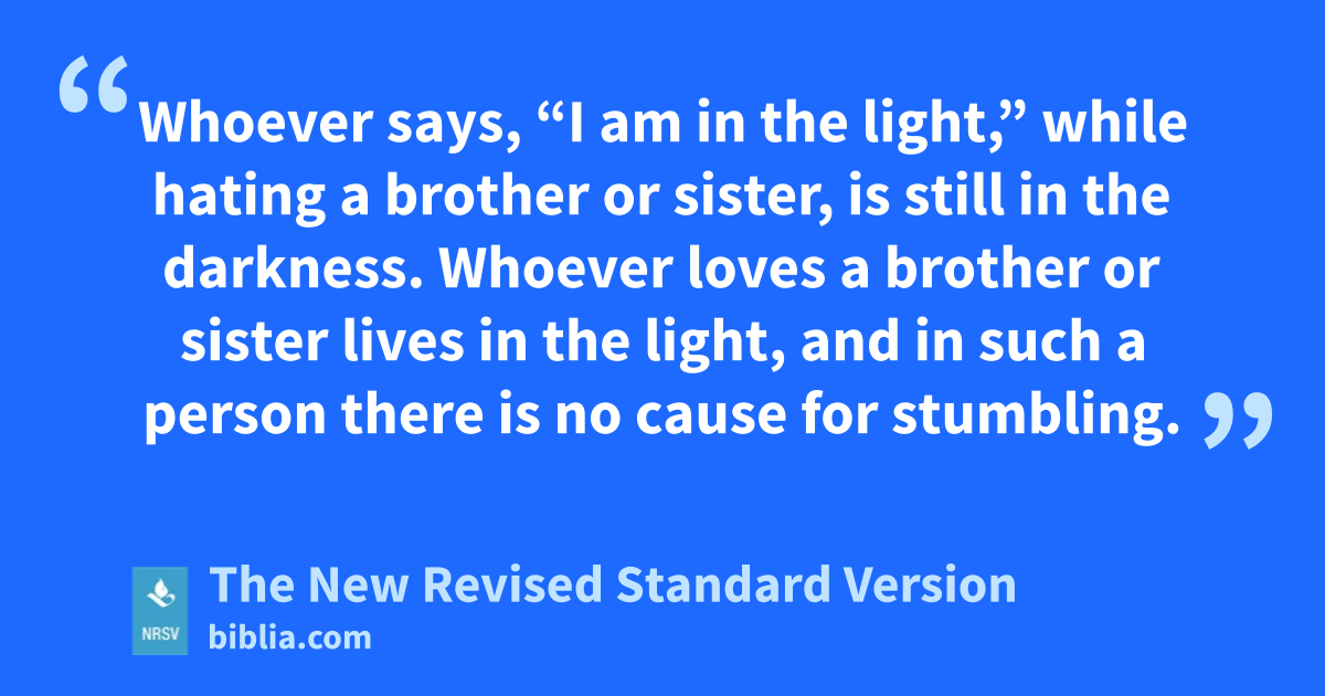 Whoever says, “I am in the light,” while hating a brother or sister, is still in the darkness. Whoever loves a brother or sister lives in the light, and in such a person there is no cause for stumbling.