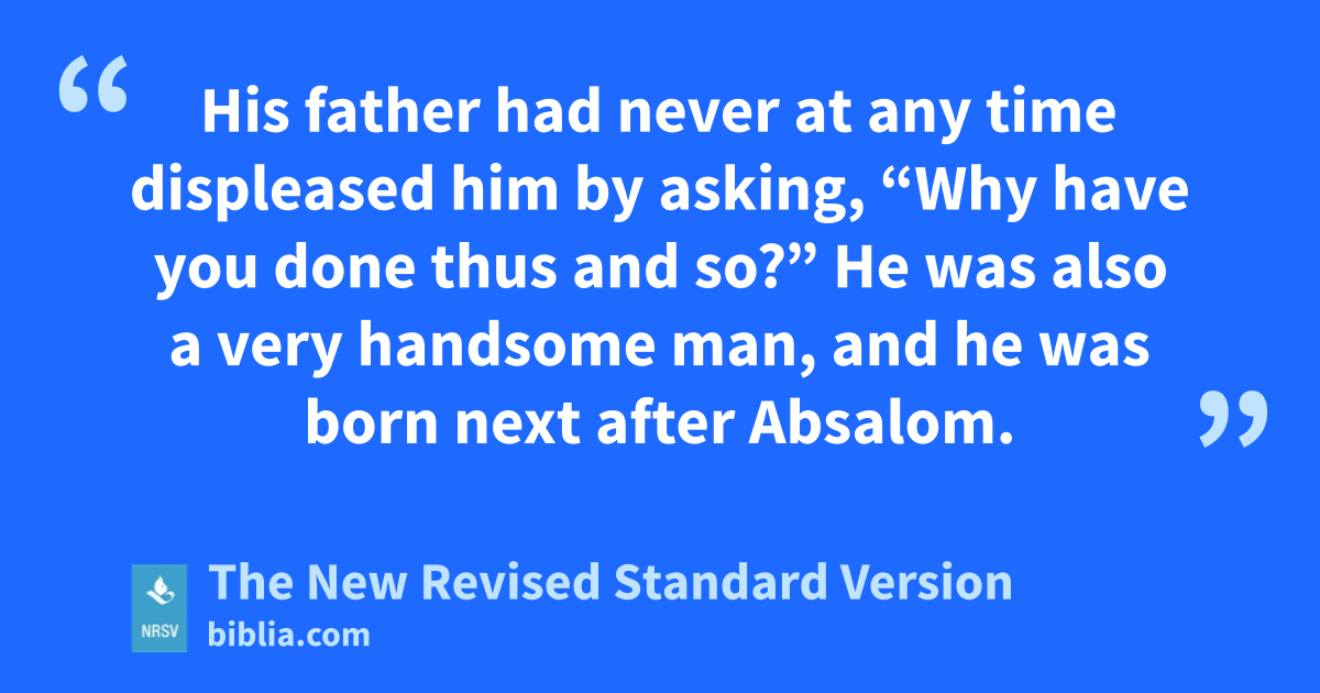 His father had never at any time displeased him by asking, “Why have you done thus and so?” He was also a very handsome man, and he was born next after Absalom.