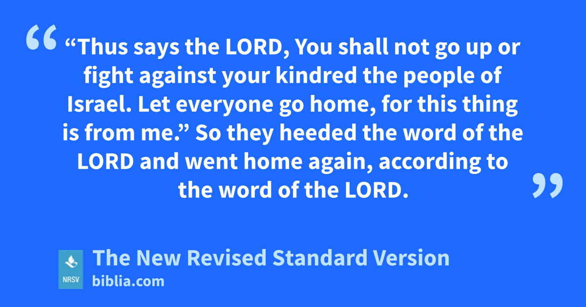 “Thus says the LORD, You shall not go up or fight against your kindred the people of Israel. Let everyone go home, for this thing is from me.” So they heeded the word of the LORD and went home again, according to the word of the LORD.