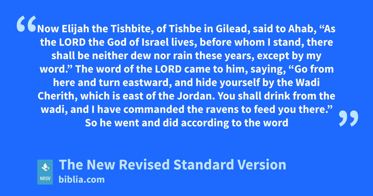 Now Elijah the Tishbite, of Tishbe in Gilead, said to Ahab, “As the LORD the God of Israel lives, before whom I stand, there shall be neither dew nor rain these years, except by my word.” The word of the LORD came to him, saying, “Go from here and turn eastward, and hide yourself by the Wadi Cherith, which is east of the Jordan. You shall drink from the wadi, and I have commanded the ravens to feed you there.” So he went and did according to the word
