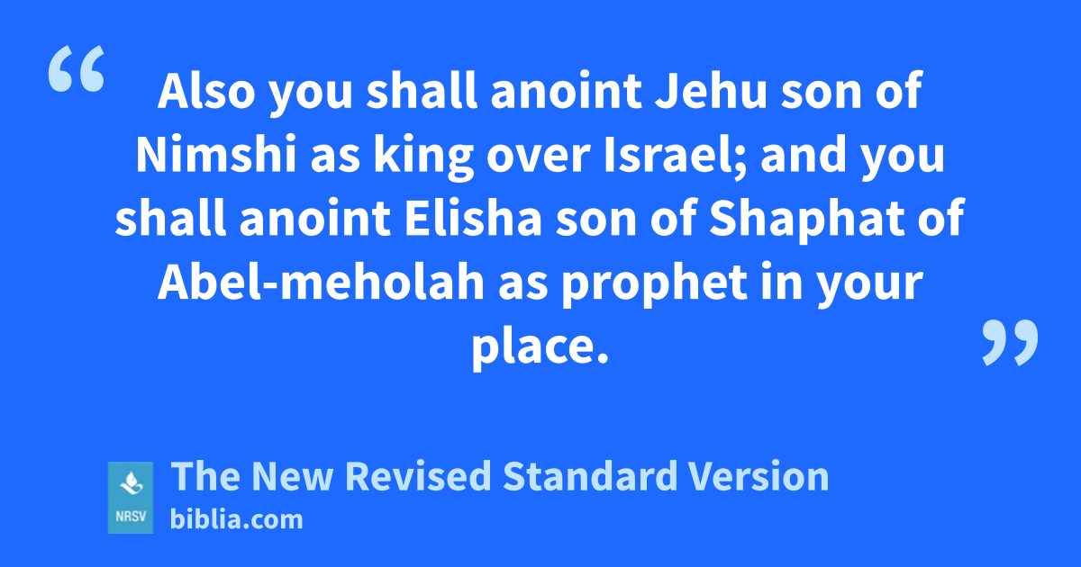 Also you shall anoint Jehu son of Nimshi as king over Israel; and you shall anoint Elisha son of Shaphat of Abel-meholah as prophet in your place.