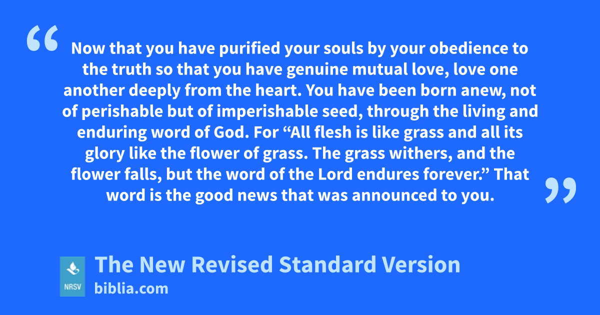 Now that you have purified your souls by your obedience to the truth so that you have genuine mutual love, love one another deeply from the heart. You have been born anew, not of perishable but of imperishable seed, through the living and enduring word of God. For “All flesh is like grass and all its glory like the flower of grass. The grass withers, and the flower falls, but the word of the Lord endures forever.” That word is the good news that was announced to you.