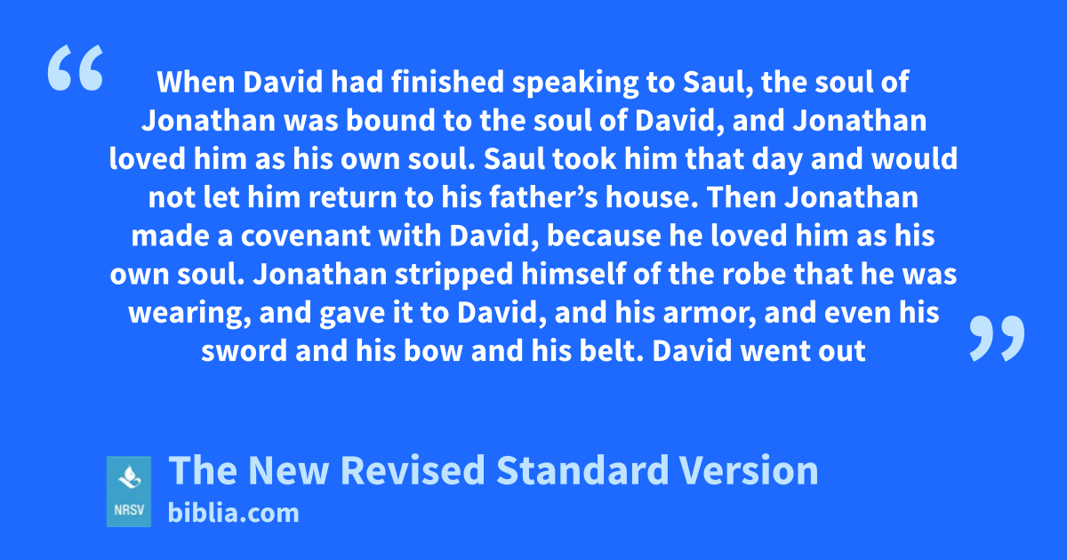 When David had finished speaking to Saul, the soul of Jonathan was bound to the soul of David, and Jonathan loved him as his own soul. Saul took him that day and would not let him return to his father’s house. Then Jonathan made a covenant with David, because he loved him as his own soul. Jonathan stripped himself of the robe that he was wearing, and gave it to David, and his armor, and even his sword and his bow and his belt. David went out