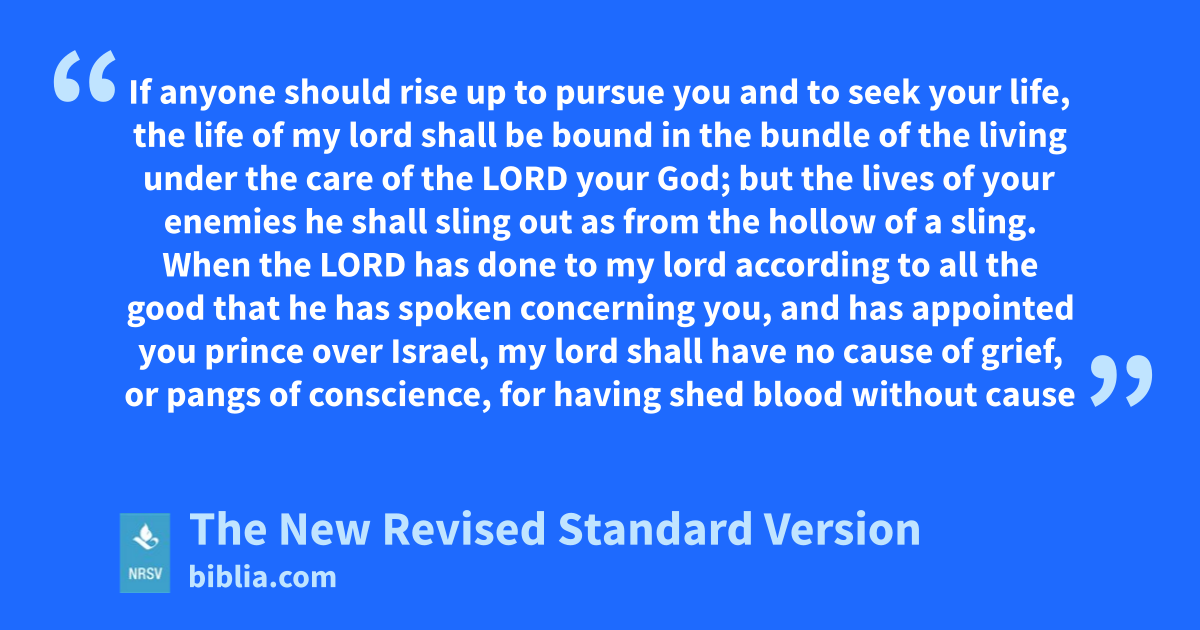 If anyone should rise up to pursue you and to seek your life, the life of my lord shall be bound in the bundle of the living under the care of the LORD your God; but the lives of your enemies he shall sling out as from the hollow of a sling. When the LORD has done to my lord according to all the good that he has spoken concerning you, and has appointed you prince over Israel, my lord shall have no cause of grief, or pangs of conscience, for having shed blood without cause