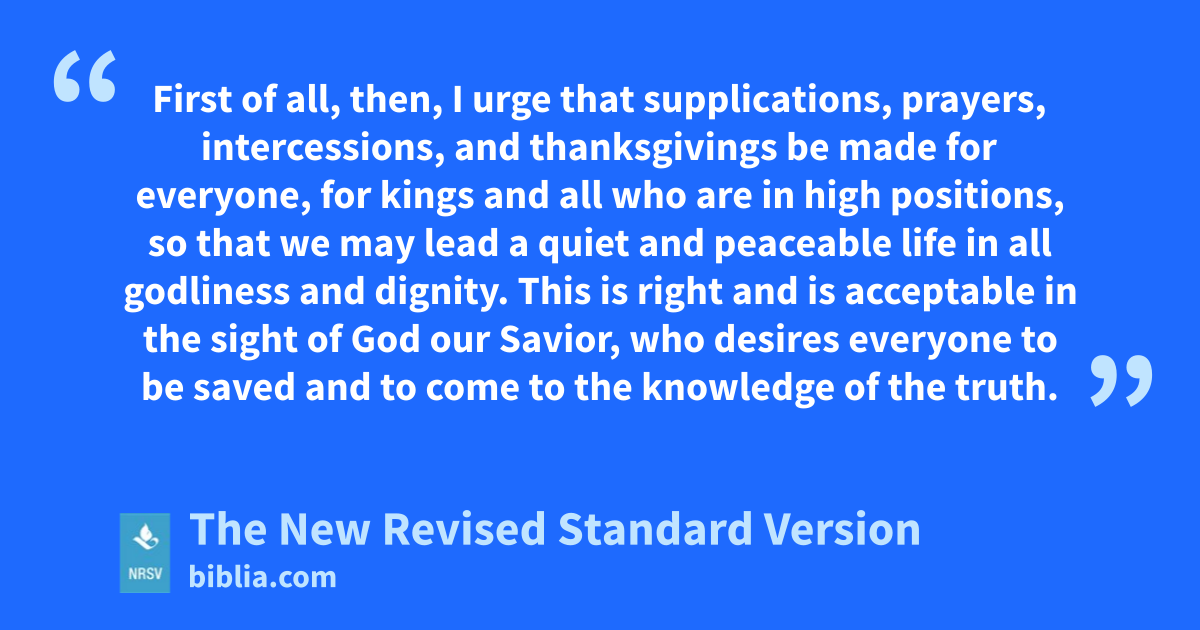 First of all, then, I urge that supplications, prayers, intercessions, and thanksgivings be made for everyone, for kings and all who are in high positions, so that we may lead a quiet and peaceable life in all godliness and dignity. This is right and is acceptable in the sight of God our Savior, who desires everyone to be saved and to come to the knowledge of the truth.
