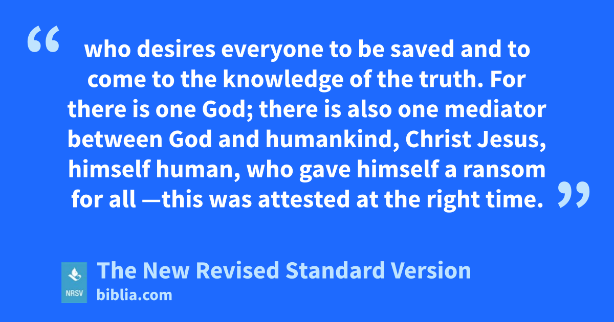 who desires everyone to be saved and to come to the knowledge of the truth. For there is one God; there is also one mediator between God and humankind, Christ Jesus, himself human, who gave himself a ransom for all —this was attested at the right time.