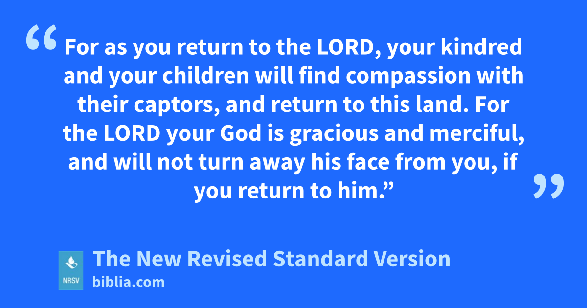For as you return to the LORD, your kindred and your children will find compassion with their captors, and return to this land. For the LORD your God is gracious and merciful, and will not turn away his face from you, if you return to him.”