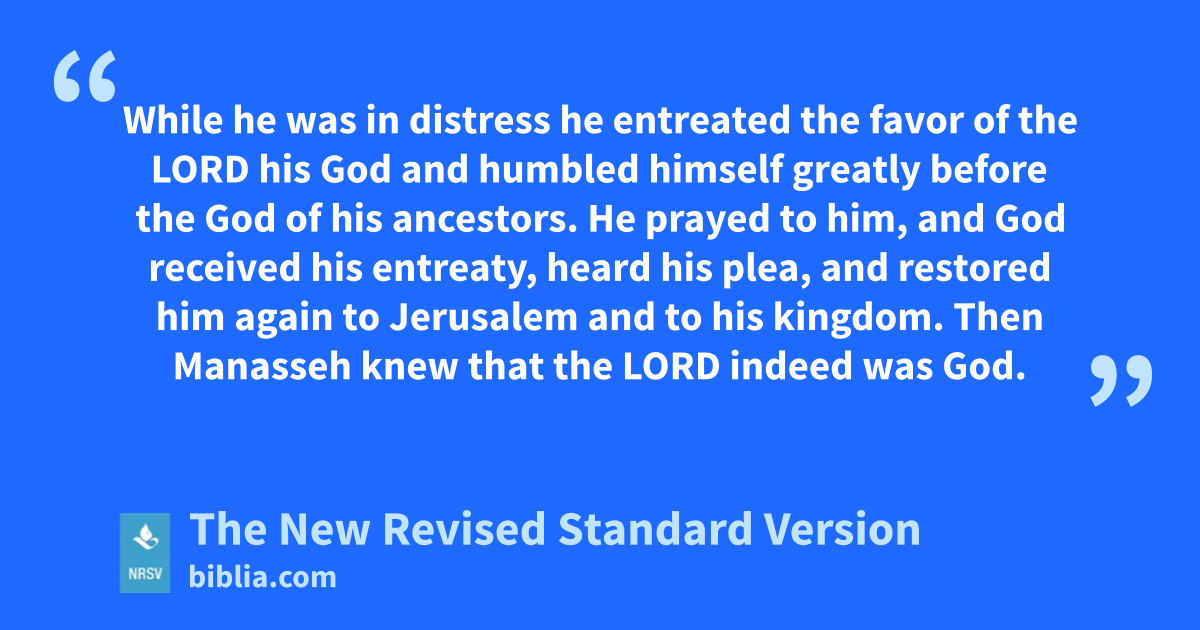 While he was in distress he entreated the favor of the LORD his God and humbled himself greatly before the God of his ancestors. He prayed to him, and God received his entreaty, heard his plea, and restored him again to Jerusalem and to his kingdom. Then Manasseh knew that the LORD indeed was God.