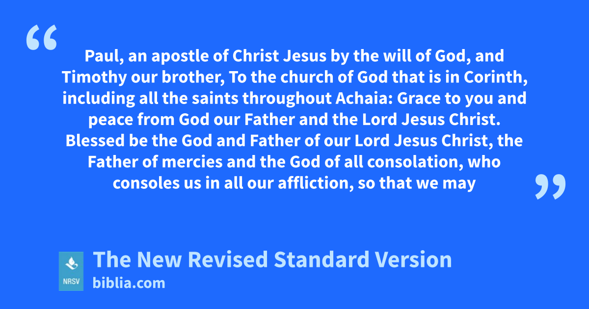 Paul, an apostle of Christ Jesus by the will of God, and Timothy our brother, To the church of God that is in Corinth, including all the saints throughout Achaia: Grace to you and peace from God our Father and the Lord Jesus Christ. Blessed be the God and Father of our Lord Jesus Christ, the Father of mercies and the God of all consolation, who consoles us in all our affliction, so that we may