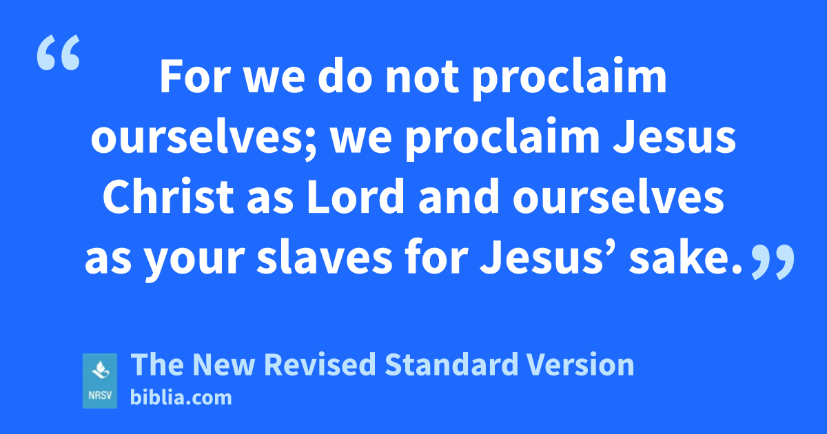 For we do not proclaim ourselves; we proclaim Jesus Christ as Lord and ourselves as your slaves for Jesus’ sake.