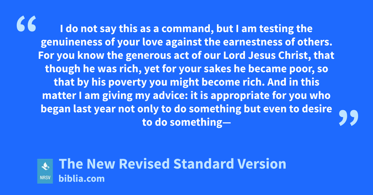 I do not say this as a command, but I am testing the genuineness of your love against the earnestness of others. For you know the generous act of our Lord Jesus Christ, that though he was rich, yet for your sakes he became poor, so that by his poverty you might become rich. And in this matter I am giving my advice: it is appropriate for you who began last year not only to do something but even to desire to do something—