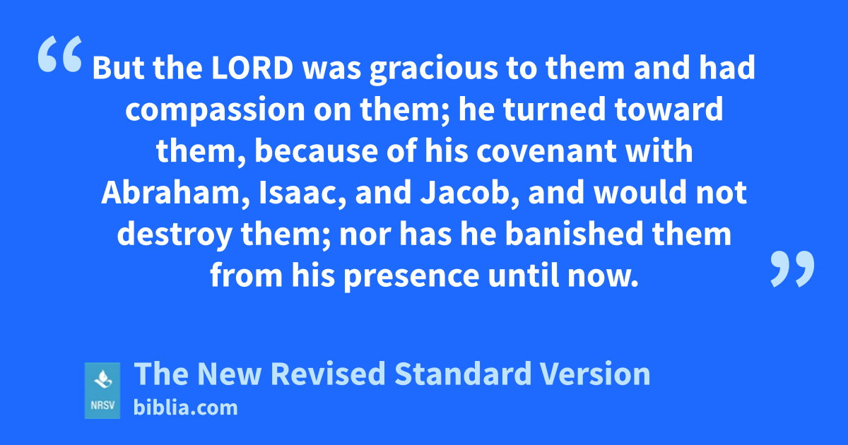 But the LORD was gracious to them and had compassion on them; he turned toward them, because of his covenant with Abraham, Isaac, and Jacob, and would not destroy them; nor has he banished them from his presence until now.