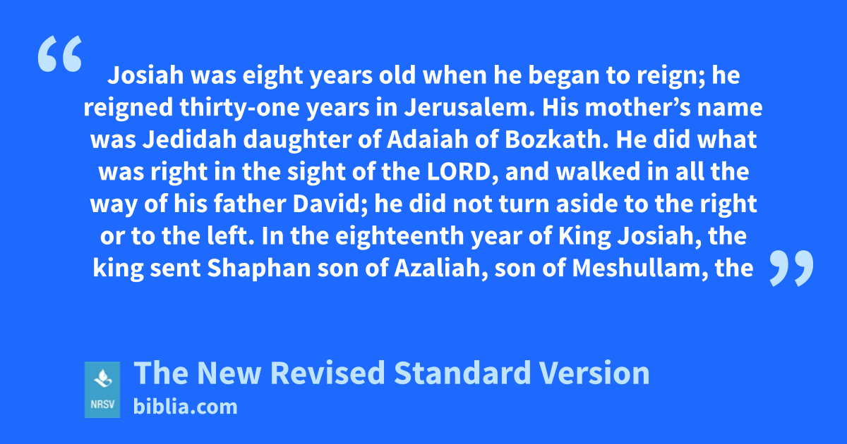 Josiah was eight years old when he began to reign; he reigned thirty-one years in Jerusalem. His mother’s name was Jedidah daughter of Adaiah of Bozkath. He did what was right in the sight of the LORD, and walked in all the way of his father David; he did not turn aside to the right or to the left. In the eighteenth year of King Josiah, the king sent Shaphan son of Azaliah, son of Meshullam, the