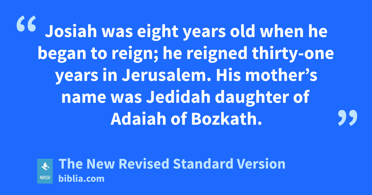 Josiah was eight years old when he began to reign; he reigned thirty-one years in Jerusalem. His mother’s name was Jedidah daughter of Adaiah of Bozkath.