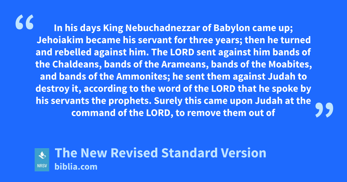 In his days King Nebuchadnezzar of Babylon came up; Jehoiakim became his servant for three years; then he turned and rebelled against him. The LORD sent against him bands of the Chaldeans, bands of the Arameans, bands of the Moabites, and bands of the Ammonites; he sent them against Judah to destroy it, according to the word of the LORD that he spoke by his servants the prophets. Surely this came upon Judah at the command of the LORD, to remove them out of