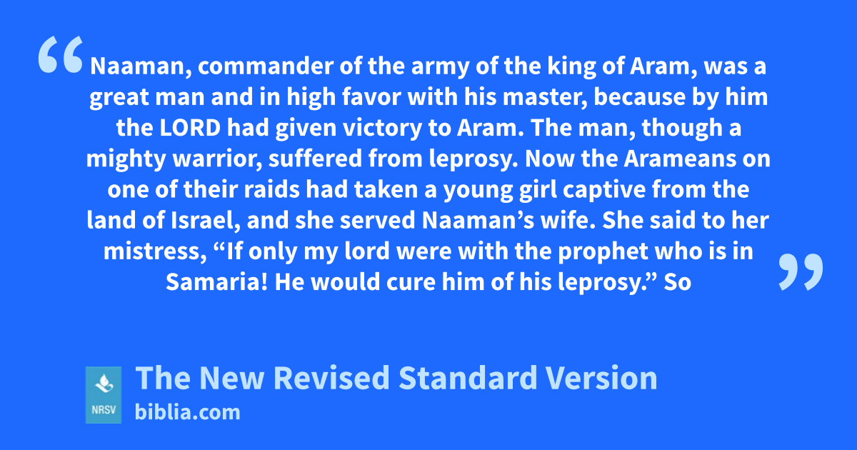 Naaman, commander of the army of the king of Aram, was a great man and in high favor with his master, because by him the LORD had given victory to Aram. The man, though a mighty warrior, suffered from leprosy. Now the Arameans on one of their raids had taken a young girl captive from the land of Israel, and she served Naaman’s wife. She said to her mistress, “If only my lord were with the prophet who is in Samaria! He would cure him of his leprosy.” So