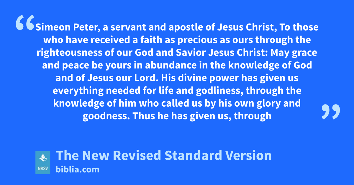 Simeon Peter, a servant and apostle of Jesus Christ, To those who have received a faith as precious as ours through the righteousness of our God and Savior Jesus Christ: May grace and peace be yours in abundance in the knowledge of God and of Jesus our Lord. His divine power has given us everything needed for life and godliness, through the knowledge of him who called us by his own glory and goodness. Thus he has given us, through