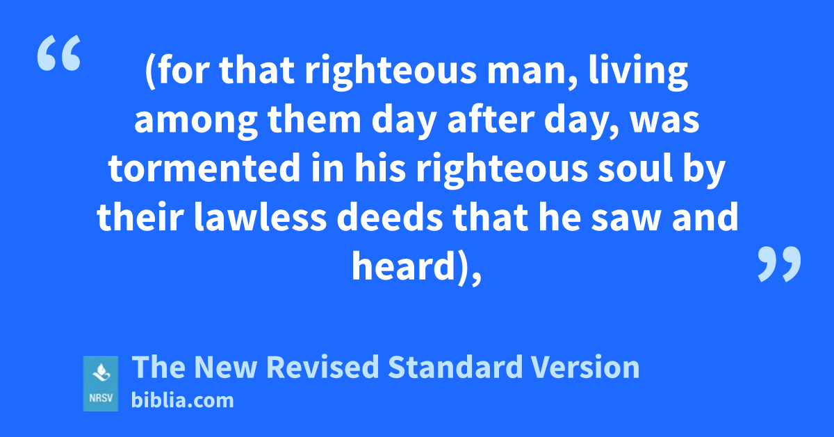 (for that righteous man, living among them day after day, was tormented in his righteous soul by their lawless deeds that he saw and heard),