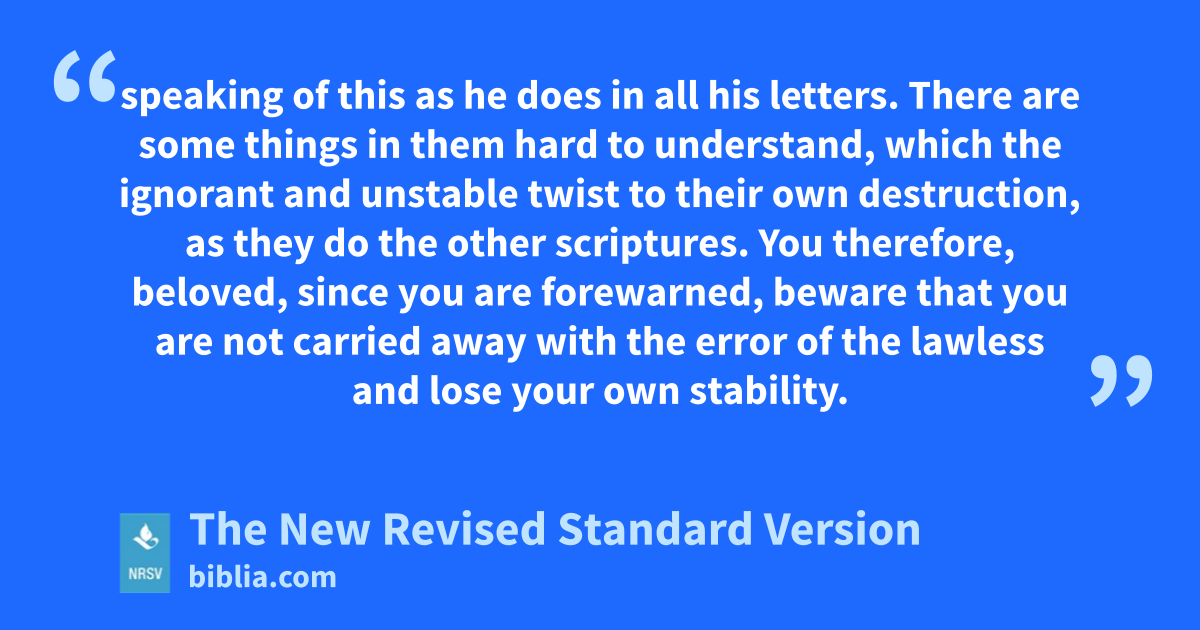 speaking of this as he does in all his letters. There are some things in them hard to understand, which the ignorant and unstable twist to their own destruction, as they do the other scriptures. You therefore, beloved, since you are forewarned, beware that you are not carried away with the error of the lawless and lose your own stability.
