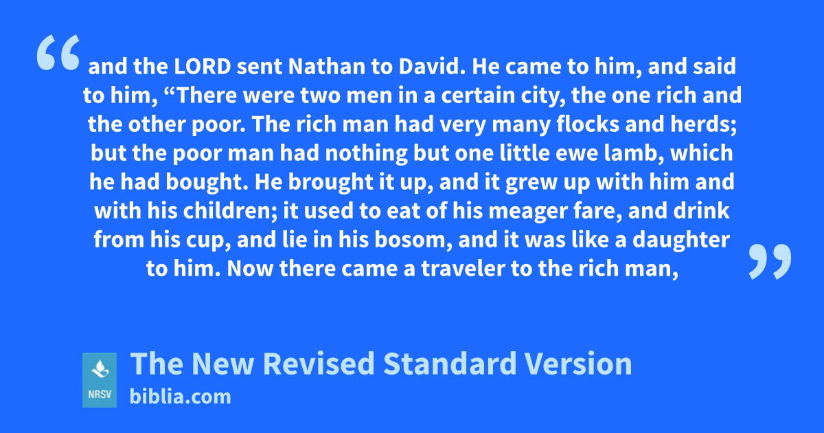 and the LORD sent Nathan to David. He came to him, and said to him, “There were two men in a certain city, the one rich and the other poor. The rich man had very many flocks and herds; but the poor man had nothing but one little ewe lamb, which he had bought. He brought it up, and it grew up with him and with his children; it used to eat of his meager fare, and drink from his cup, and lie in his bosom, and it was like a daughter to him. Now there came a traveler to the rich man,