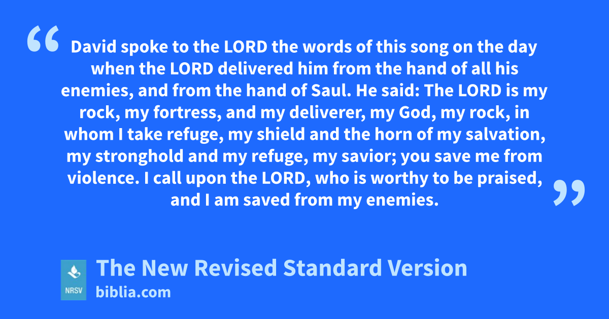 David spoke to the LORD the words of this song on the day when the LORD delivered him from the hand of all his enemies, and from the hand of Saul. He said: The LORD is my rock, my fortress, and my deliverer, my God, my rock, in whom I take refuge, my shield and the horn of my salvation, my stronghold and my refuge, my savior; you save me from violence. I call upon the LORD, who is worthy to be praised, and I am saved from my enemies.