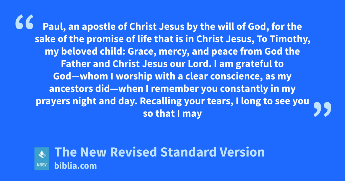 Paul, an apostle of Christ Jesus by the will of God, for the sake of the promise of life that is in Christ Jesus, To Timothy, my beloved child: Grace, mercy, and peace from God the Father and Christ Jesus our Lord. I am grateful to God—whom I worship with a clear conscience, as my ancestors did—when I remember you constantly in my prayers night and day. Recalling your tears, I long to see you so that I may