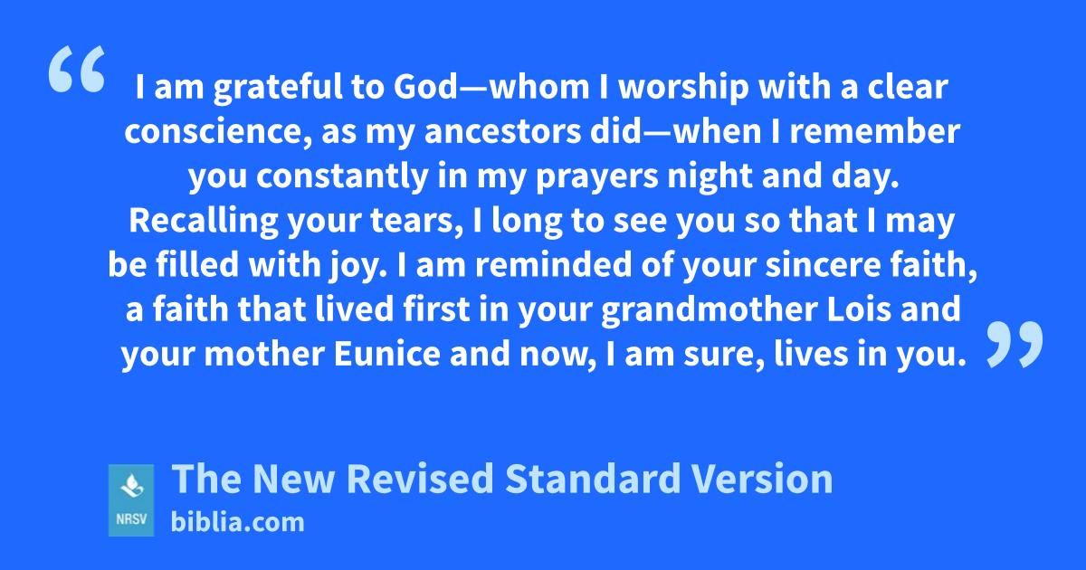 I am grateful to God—whom I worship with a clear conscience, as my ancestors did—when I remember you constantly in my prayers night and day. Recalling your tears, I long to see you so that I may be filled with joy. I am reminded of your sincere faith, a faith that lived first in your grandmother Lois and your mother Eunice and now, I am sure, lives in you.