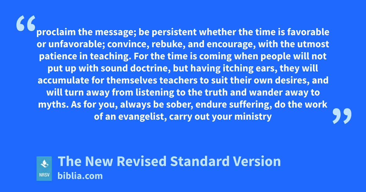 proclaim the message; be persistent whether the time is favorable or unfavorable; convince, rebuke, and encourage, with the utmost patience in teaching. For the time is coming when people will not put up with sound doctrine, but having itching ears, they will accumulate for themselves teachers to suit their own desires, and will turn away from listening to the truth and wander away to myths. As for you, always be sober, endure suffering, do the work of an evangelist, carry out your ministry