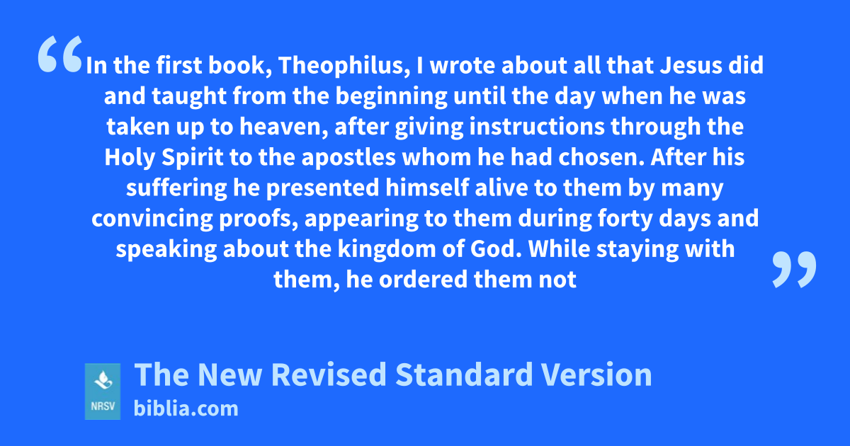 In the first book, Theophilus, I wrote about all that Jesus did and taught from the beginning until the day when he was taken up to heaven, after giving instructions through the Holy Spirit to the apostles whom he had chosen. After his suffering he presented himself alive to them by many convincing proofs, appearing to them during forty days and speaking about the kingdom of God. While staying with them, he ordered them not