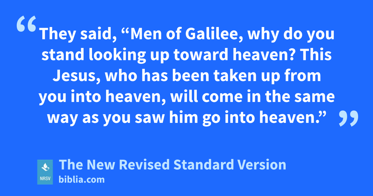They said, “Men of Galilee, why do you stand looking up toward heaven? This Jesus, who has been taken up from you into heaven, will come in the same way as you saw him go into heaven.”