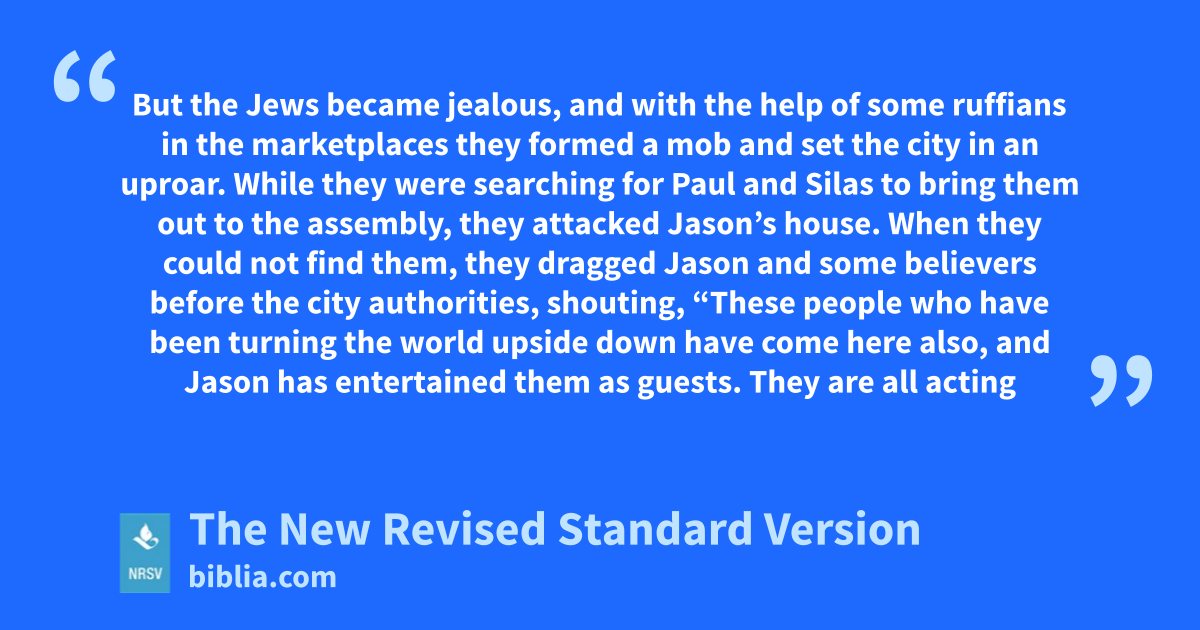But the Jews became jealous, and with the help of some ruffians in the marketplaces they formed a mob and set the city in an uproar. While they were searching for Paul and Silas to bring them out to the assembly, they attacked Jason’s house. When they could not find them, they dragged Jason and some believers before the city authorities, shouting, “These people who have been turning the world upside down have come here also, and Jason has entertained them as guests. They are all acting