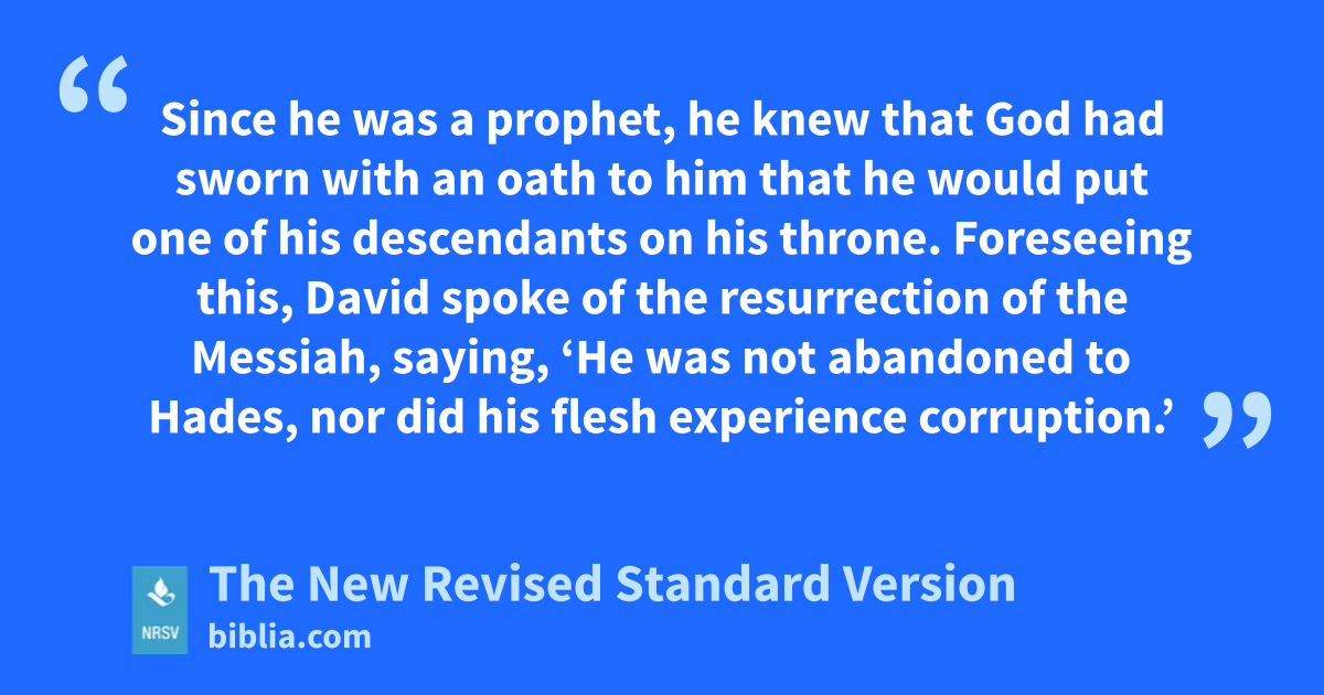 Since he was a prophet, he knew that God had sworn with an oath to him that he would put one of his descendants on his throne. Foreseeing this, David spoke of the resurrection of the Messiah, saying, ‘He was not abandoned to Hades, nor did his flesh experience corruption.’