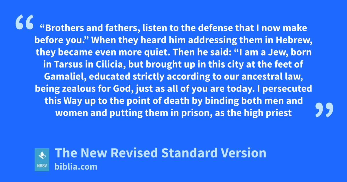 “Brothers and fathers, listen to the defense that I now make before you.” When they heard him addressing them in Hebrew, they became even more quiet. Then he said: “I am a Jew, born in Tarsus in Cilicia, but brought up in this city at the feet of Gamaliel, educated strictly according to our ancestral law, being zealous for God, just as all of you are today. I persecuted this Way up to the point of death by binding both men and women and putting them in prison, as the high priest