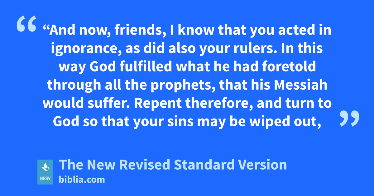 “And now, friends, I know that you acted in ignorance, as did also your rulers. In this way God fulfilled what he had foretold through all the prophets, that his Messiah would suffer. Repent therefore, and turn to God so that your sins may be wiped out,