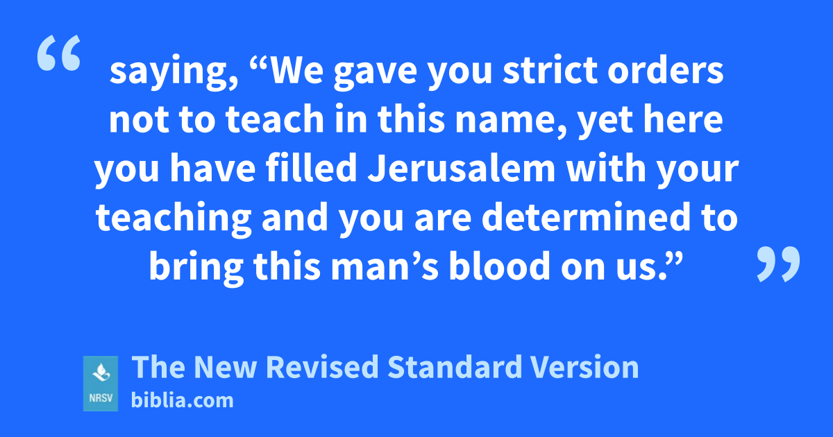 saying, “We gave you strict orders not to teach in this name, yet here you have filled Jerusalem with your teaching and you are determined to bring this man’s blood on us.”