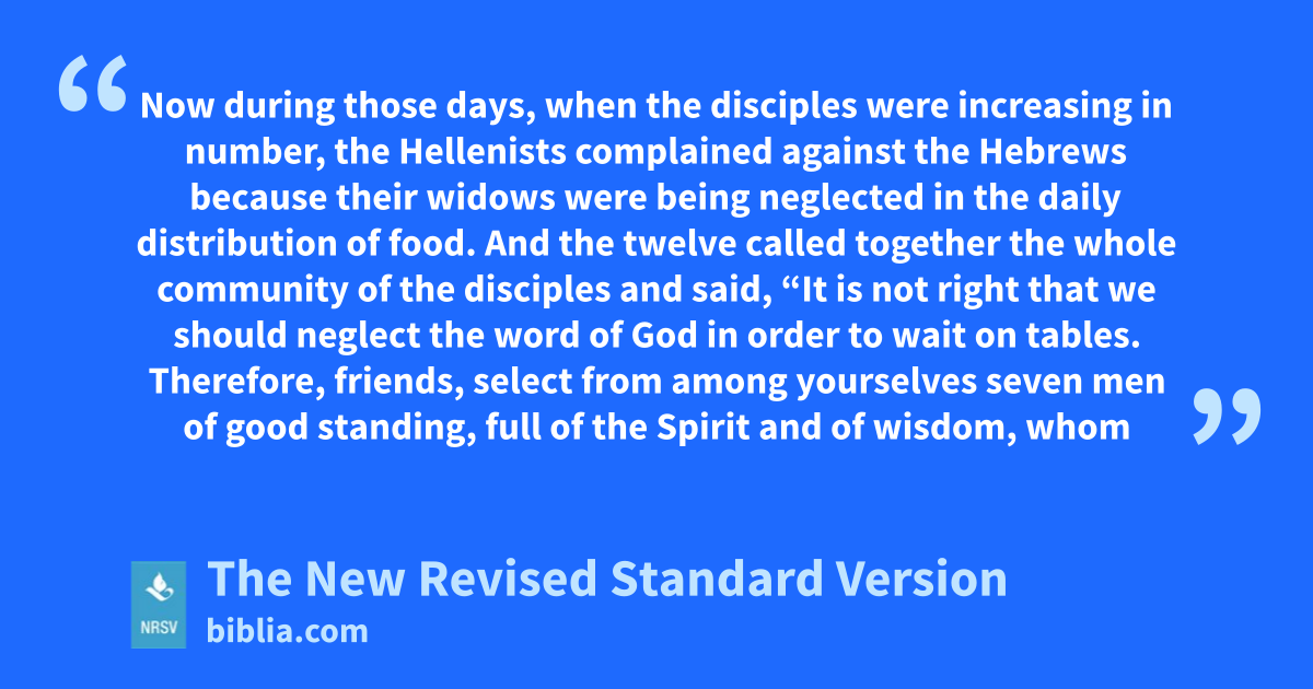 Now during those days, when the disciples were increasing in number, the Hellenists complained against the Hebrews because their widows were being neglected in the daily distribution of food. And the twelve called together the whole community of the disciples and said, “It is not right that we should neglect the word of God in order to wait on tables. Therefore, friends, select from among yourselves seven men of good standing, full of the Spirit and of wisdom, whom