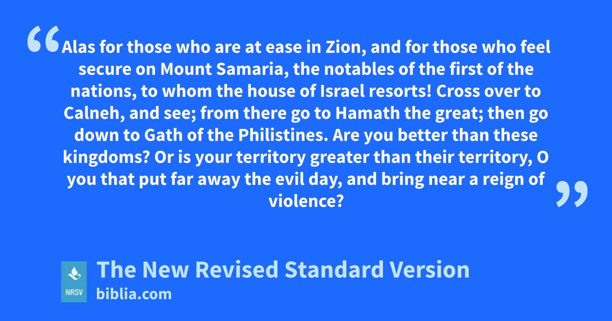 Alas for those who are at ease in Zion, and for those who feel secure on Mount Samaria, the notables of the first of the nations, to whom the house of Israel resorts! Cross over to Calneh, and see; from there go to Hamath the great; then go down to Gath of the Philistines. Are you better than these kingdoms? Or is your territory greater than their territory, O you that put far away the evil day, and bring near a reign of violence?