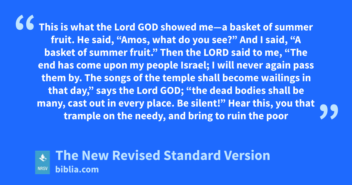 This is what the Lord GOD showed me—a basket of summer fruit. He said, “Amos, what do you see?” And I said, “A basket of summer fruit.” Then the LORD said to me, “The end has come upon my people Israel; I will never again pass them by. The songs of the temple shall become wailings in that day,” says the Lord GOD; “the dead bodies shall be many, cast out in every place. Be silent!” Hear this, you that trample on the needy, and bring to ruin the poor